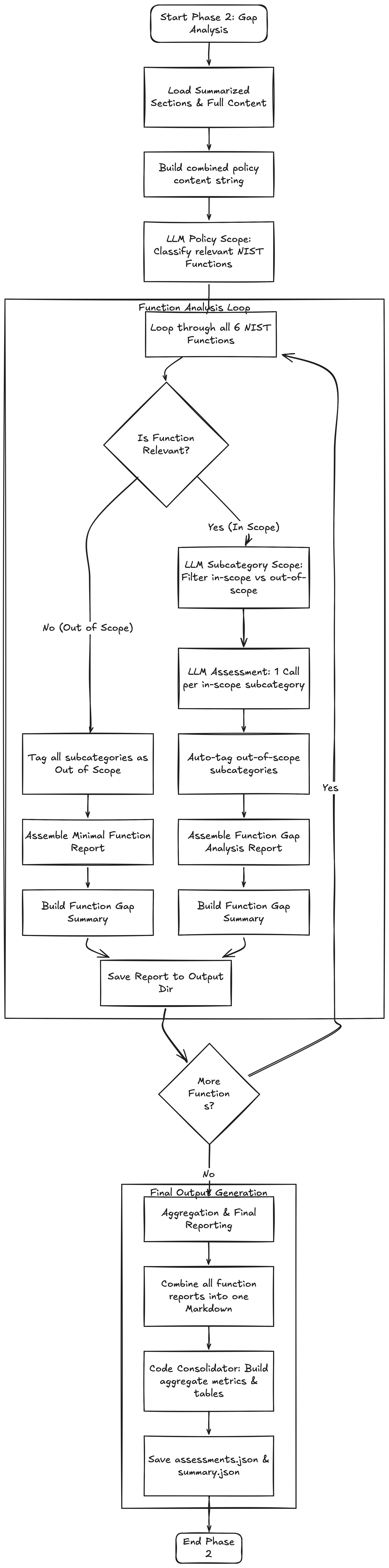 With scoping done, the analysis runs a Map-Reduce across every in-scope NIST subcategory. Map phase: scan each section for evidence related to the subcategory. Reduce phase: consolidate that evidence and make one verdict: Addressed, Partially Addressed, Not Addressed, or Out of Scope, with specific quotes from the policy as proof.