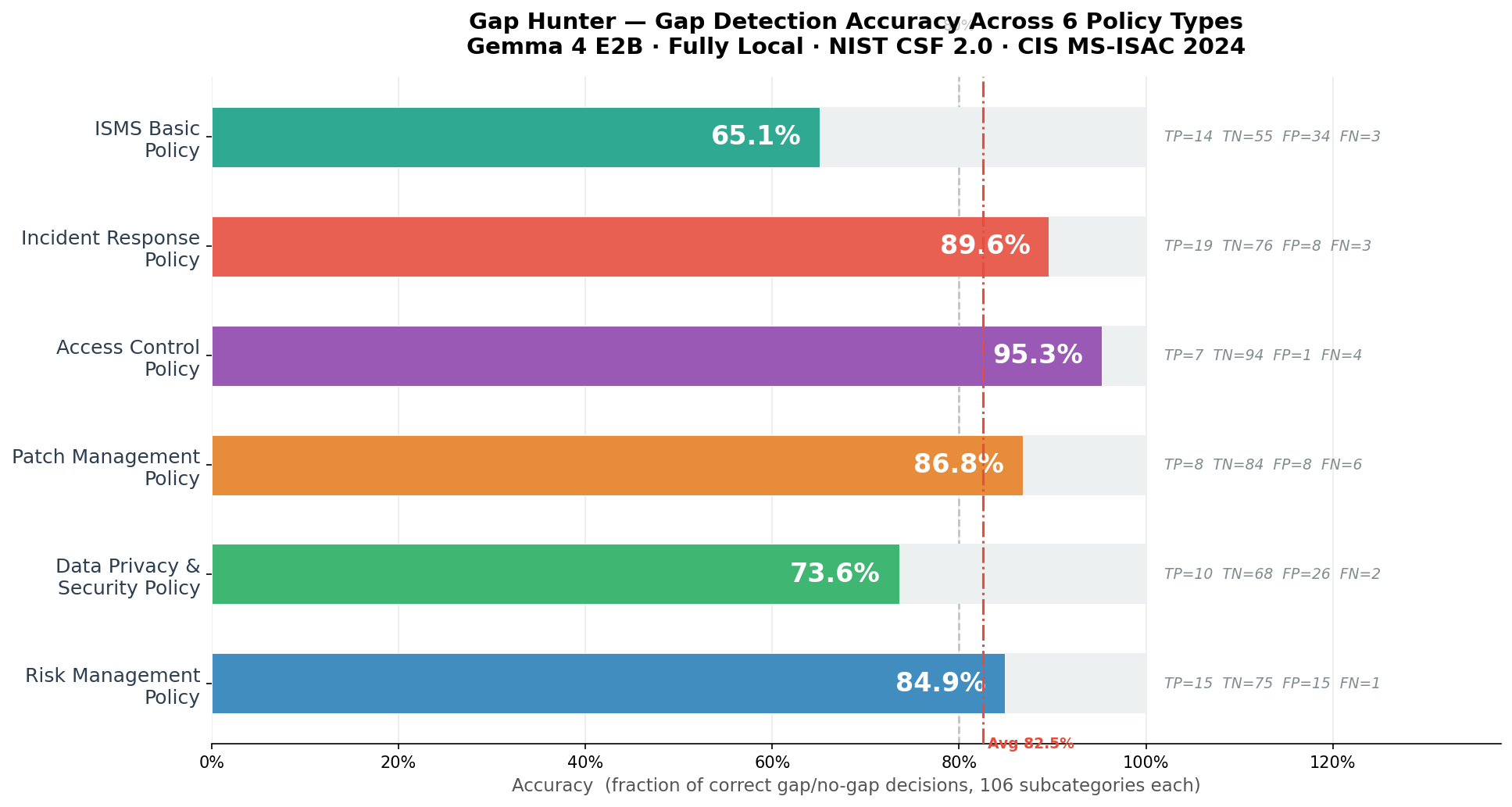 The average accuracy landed at 82.5%, with Access Control hitting 95.3% and Incident Response at 89.6%. The weakest result was ISMS Basic Policy at 65.1% — unsurprisingly, ISMS is the broadest policy type, covering the most ground, which makes scoping harder and false positives more likely.